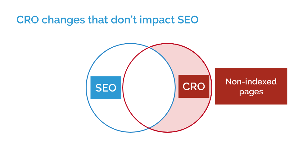 There are SEO changes that have a very low-risk or negative impact on version rates from other channels. For example, if you change the meta information that’s invisible on the page, that’s SEO and rarely changes the CRO. But on the flip side, there are CRO changes that don’t impact the organic search performances. If you do have non-indexed pages, if you change this you won’t change your rankings. You should look at the checkout process and login pages. Those aren’t indexed, so you won’t impact the SEO with that.